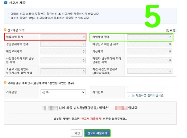 신고서 제출하기 전에 아래 매출세액 합계와 매입세액 합계를 꼭 확인하시기 바랍니다. 아래 부가가치세 금액이 -이면 환급금이 발생하고 +이면 추가로 부가가치세를 납부하셔야 됩니다.